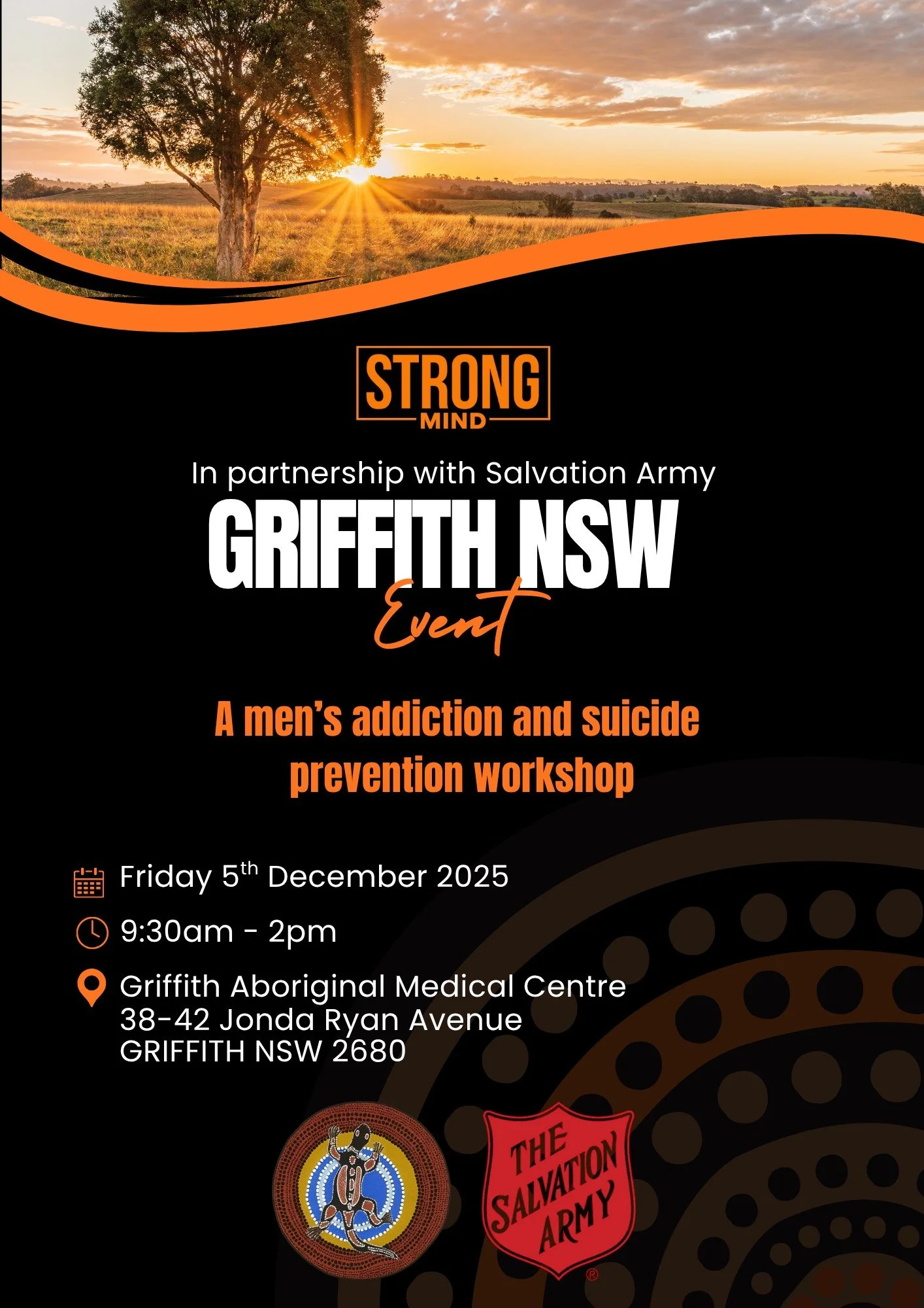 Upcoming Events GRIFFITH NSWAddiction + suicide Prevention workshopFRIDAY 5th DECEMbER 20259:30am-2pmLocation: griffith aboriginal medical centre38-42 jonda ryan ave griffith nsw 2680ALL WELCOME